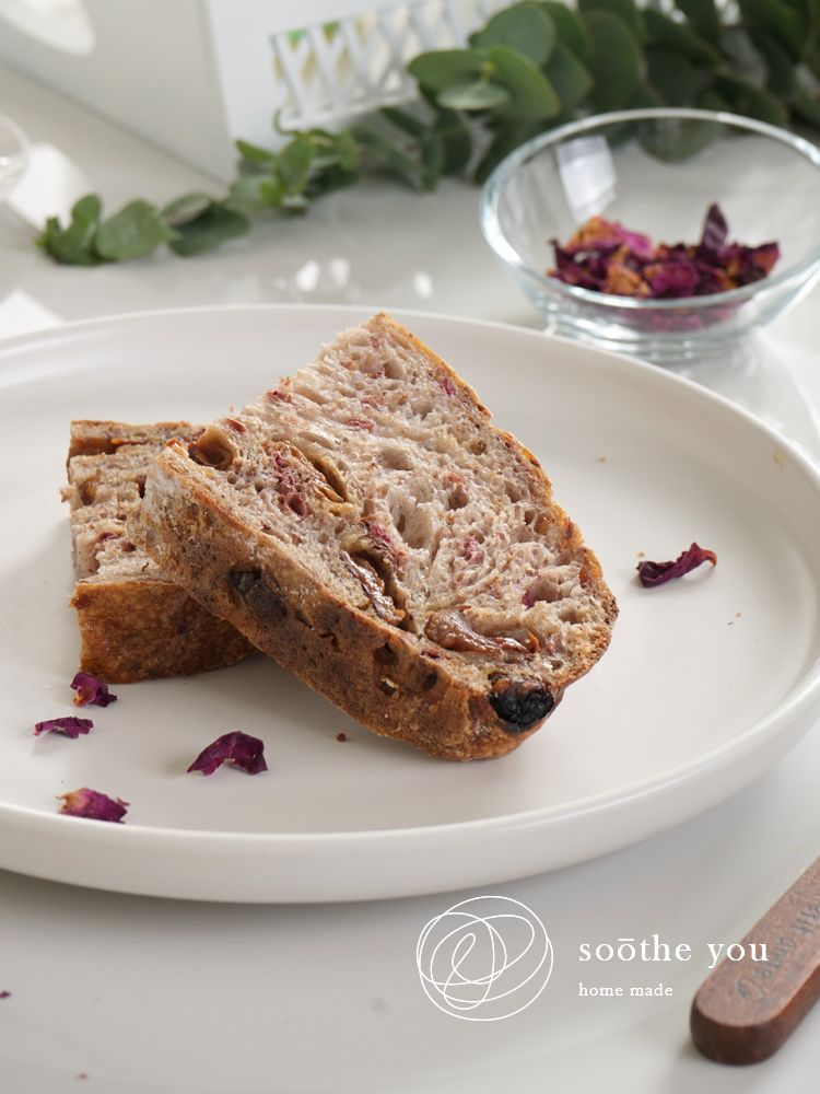 內容物/成分: 日本進口小麥麵粉、法國全麥麵粉、法國黑麥麵粉、自養黑麥魯邦菌種酵母、有機乾燥紅玫瑰花瓣USDA 、QAI 有機雙重認可、玫瑰鹽、過濾水。